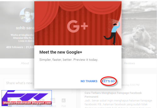Untuk mencoba google plus baru ini silahkan kunjungi situs sosial media google plus klik "lets Go"Untuk kembali ke tampilan classic silahkan pilih "kembali ke G+ classic" di bagian pojok kiri bawah.